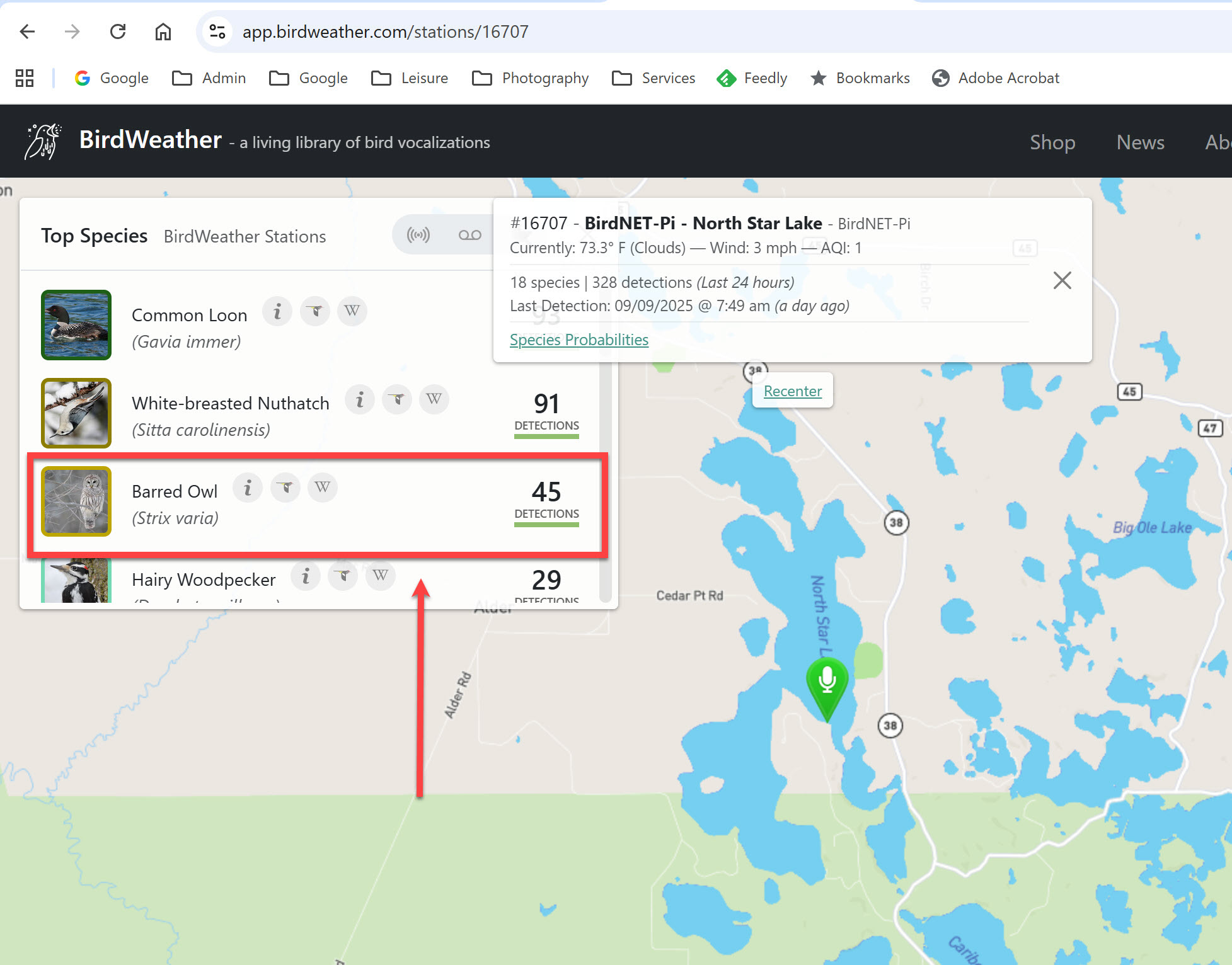 Did you know Bert and Betty, the Barred Owls have been waiting for me to pen an owl children’s book about their family? I have one problem … I have not been able to find the happy couple’s home. I have looked far and wide in the Duluth area for Bert and Betty without success. Now I may have a candidate couple at my cabin. Through my cabin’s new bird song listening device, BirdNET-Pi, I have learned there are Barred Owls at Northstar Lake. Last night they were recorded 45 times asking who was my cook! This would be too cool if I am able to find this happy couple. (my cabin’s listening station)
