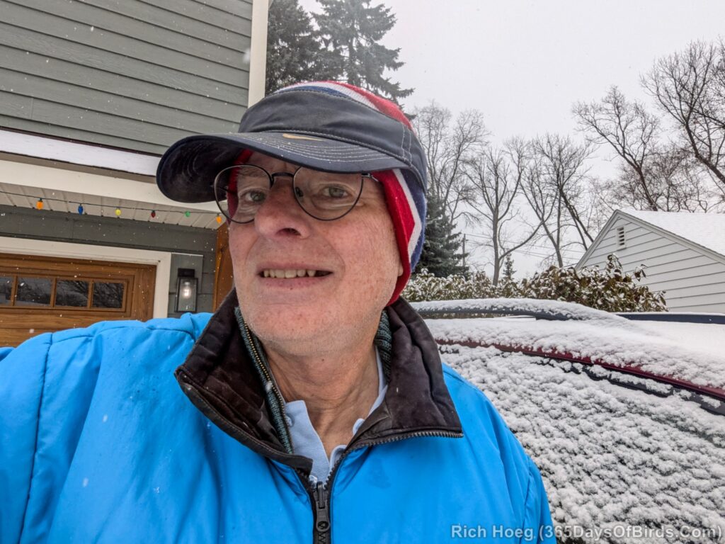 Use a golf visor in tandem with your stocking cap on cold winter days. This combination works on sunny days to provide shade, and on ugly days to keep eyeglasses dry from sleet or snow. I use the Nike Swoosh Golf Visor. Putting a visor OVER a stocking cap is much warmer than wearing a hat under a stocking cap. I have worn this combination both yesterday and today as I visited the Long-Eared Owl perch. Yesterday because it was cold and sunny, and today because of wet snow (kept the eyeglasses dry).