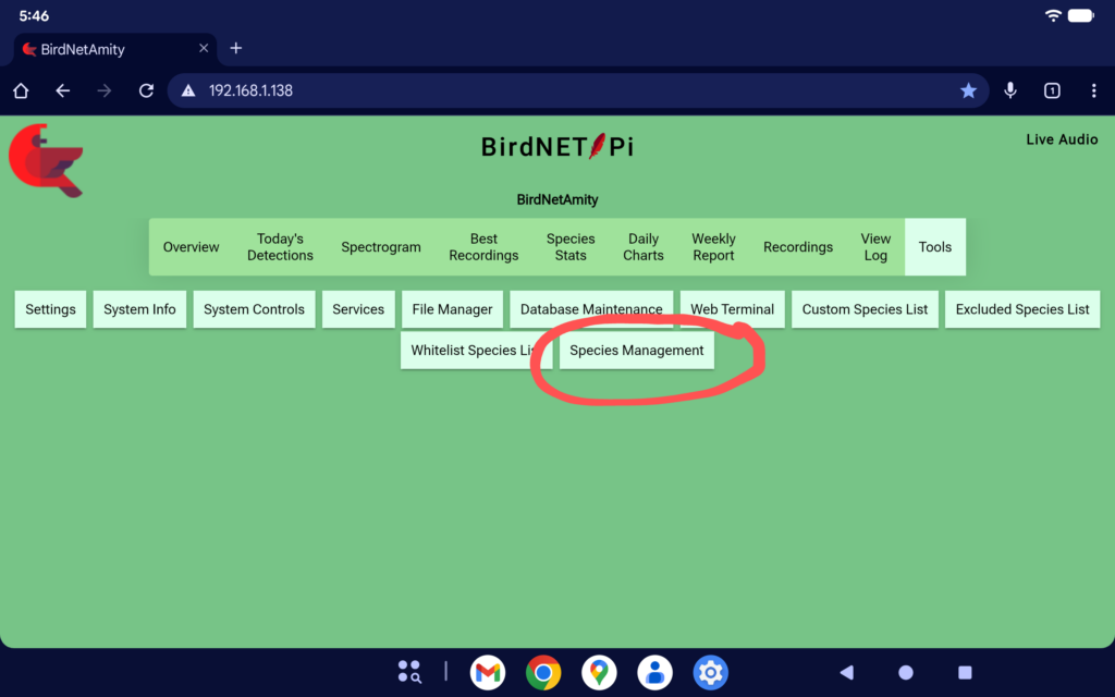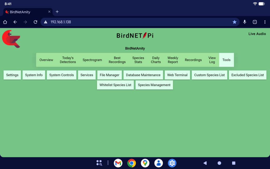 Here are the BirdNET-Pi menu command screenshots. You MUST be on your own local wifi network, and on the SAME network to which the BirdNET-Pi is connected.