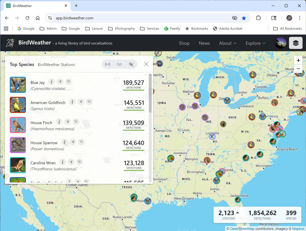 Screenshots from my listening station and the map for listening stations across the USA: (Note: Updates to this free public service sometimes lags my real time results. When I am personally logged in to my BirdNET-Pi I definitely see all identifications in real time. If you click upon my list of birds, and then an individual bird specie, you may listen to actual recordings from my device)