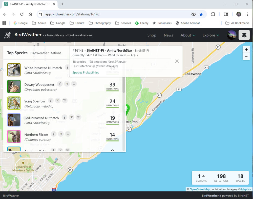 While wifi / internet access is required to build a BirdNET-Pi, after a successful installation the device runs without the need to be online, but it does need power. Here are some screenshots from the initial days of ID’ing birds singing in my yard. In fact, my installation / build was able to hear and identify birds from along Amity Creek which is across the street from my home and about 225 yards distant.