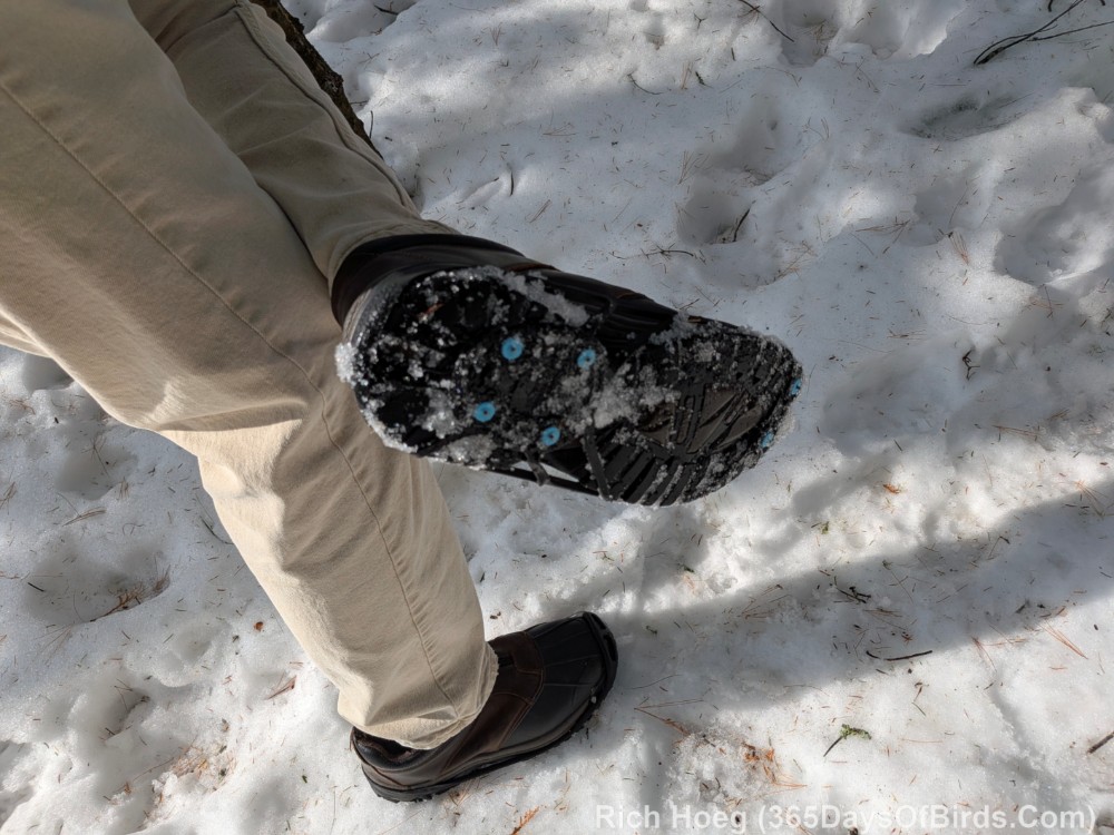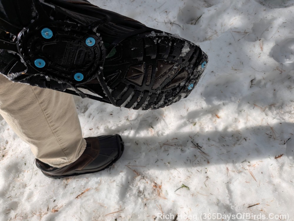 - Cleats! Golfers wear cleats. Birders who want a grip on icy trails should follow their example. See my photographs, and links. There are cleats that will pull over your trails shoes or boots. Remember to order cleats where the rubber straps are large enough to fit over your winter walking attire.