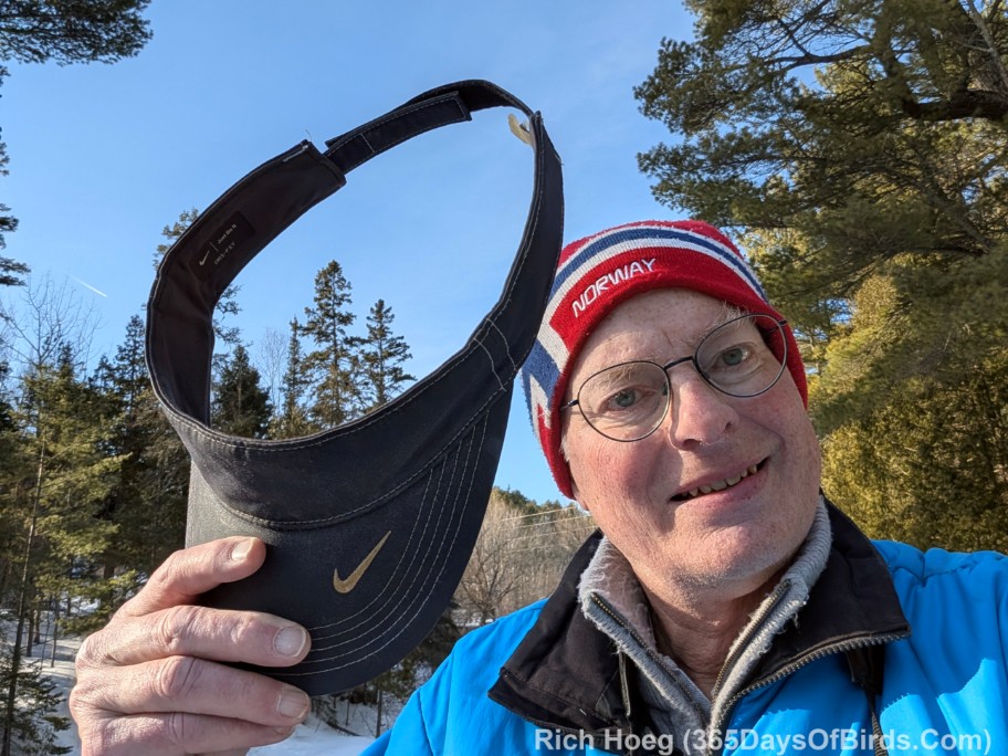 - A golf visor to protect against the sun’s glare but still allowing a person to wear a stocking cap for warmth. Cold ears are no fun. Please note I do NOT wear sunglasses while birding. The polarizing features of sunglasses make it more difficult to spot and ID birds.