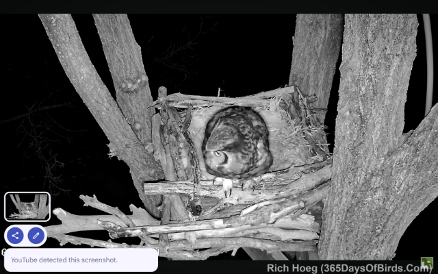 More importantly, Momma GHO said “yes” to my nesting platform and fed Fuzzball for over two weeks before the owlet fledged (YouTube link for blog subscribers … Fuzzball gets fed)