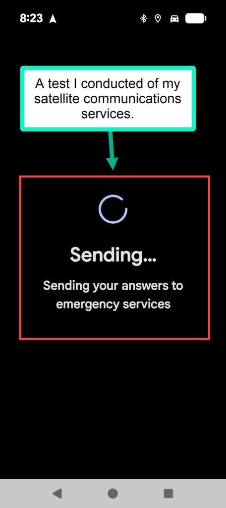 Here are three screenshots I took from my Google Pixel 10 which I took while testing the satellite service while up at Greenwood early this month. I did not actually send an emergency help request, but my phone allows me to test and understand how the service works.