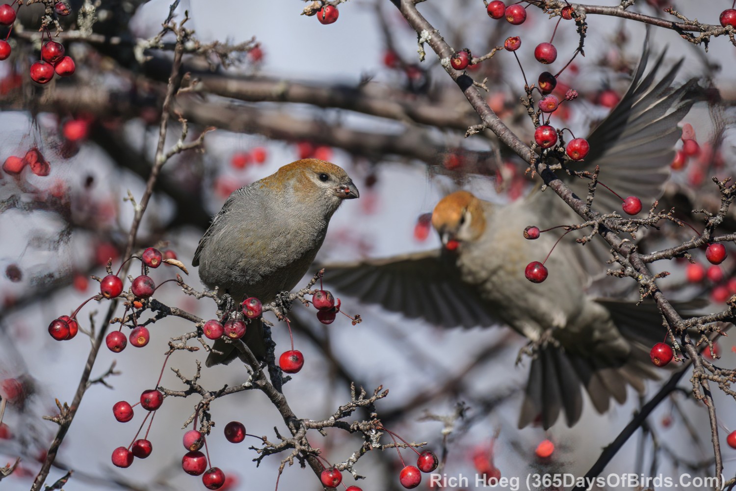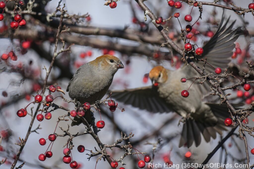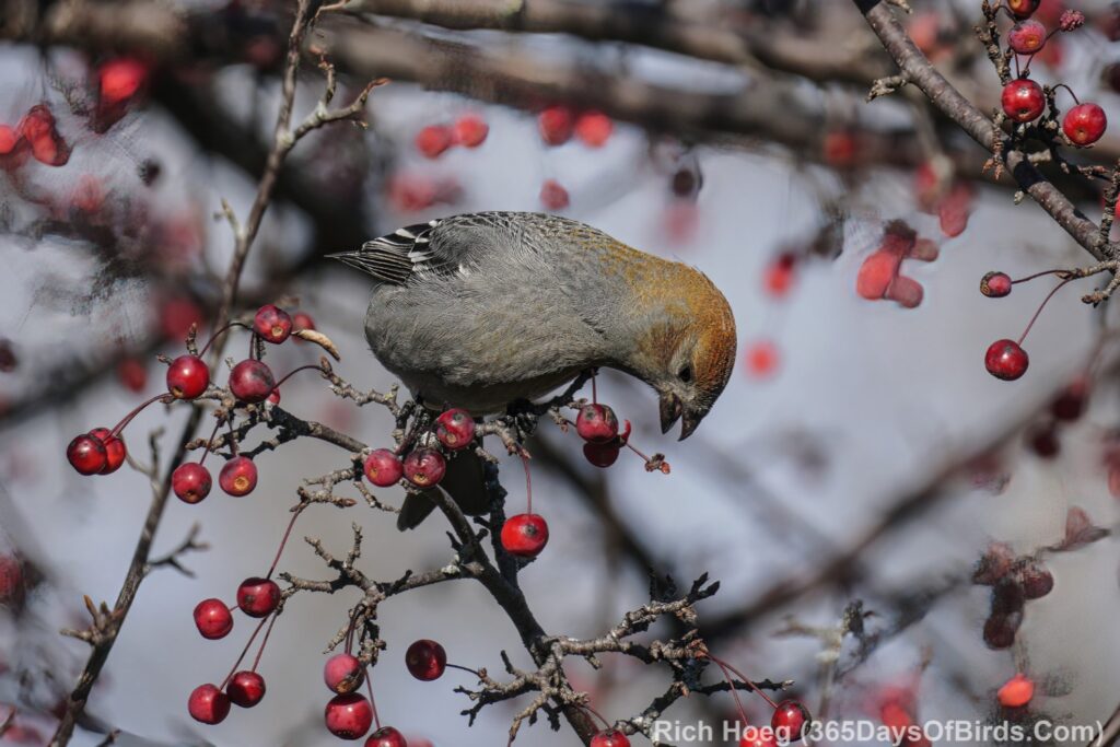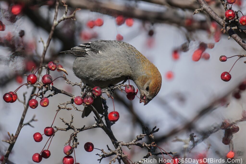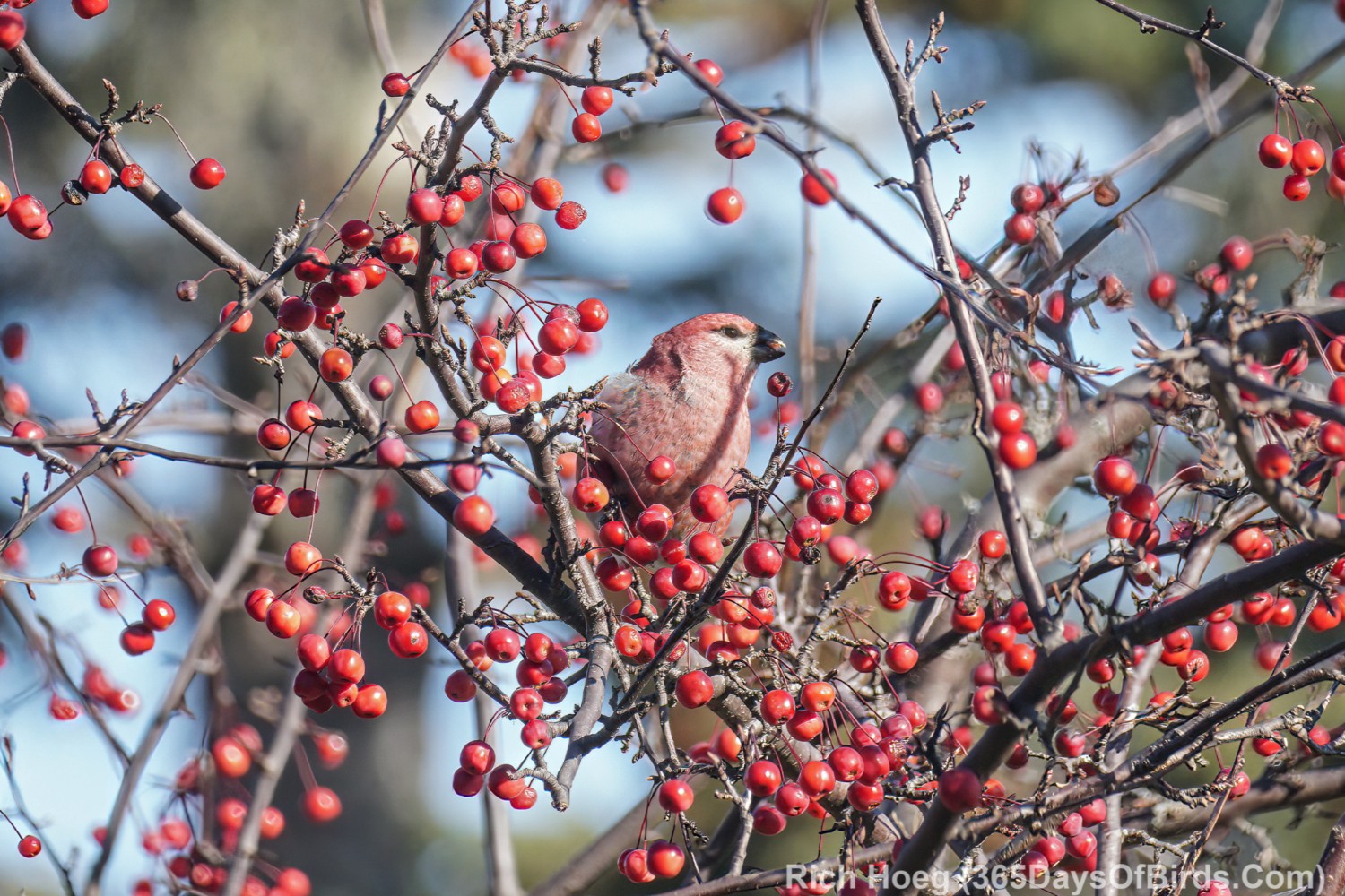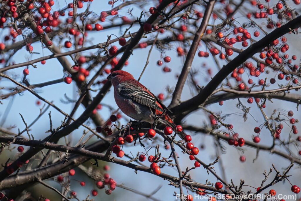 On to the photographs … the Pine Grossbeaks were real special. Essentially nary a Pine Grossbeak was seen last winter. Today I watched a small flock.