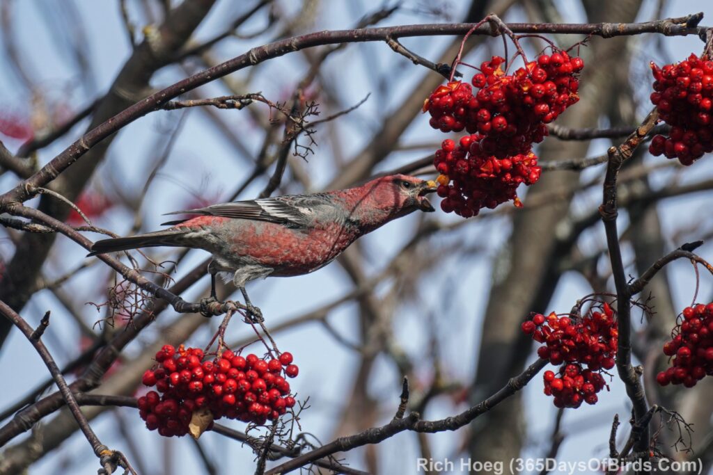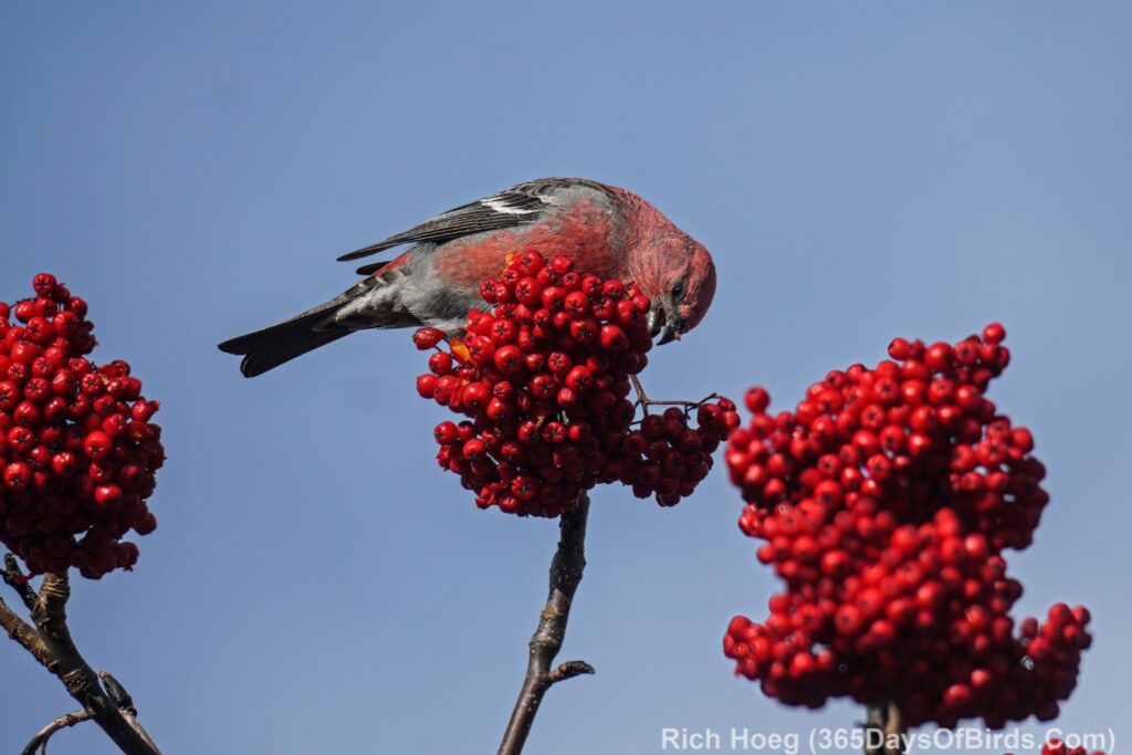What a difference a year makes. Last year the Pine Grosbeaks did not drop down from Canada into northern Minnesota. There was plenty of food for these bird species in the northern Boreal Forest, but this year that equation has changed. Both Pine Grosbeaks and Bohemian Waxwings are invading northeastern Minnesota and enjoying our bumper crop of Mountain Ash berries. In addition the NW winds tend to push migrating songbirds against the North Shore of Lake Superior which then means easier birding (note … not easy).