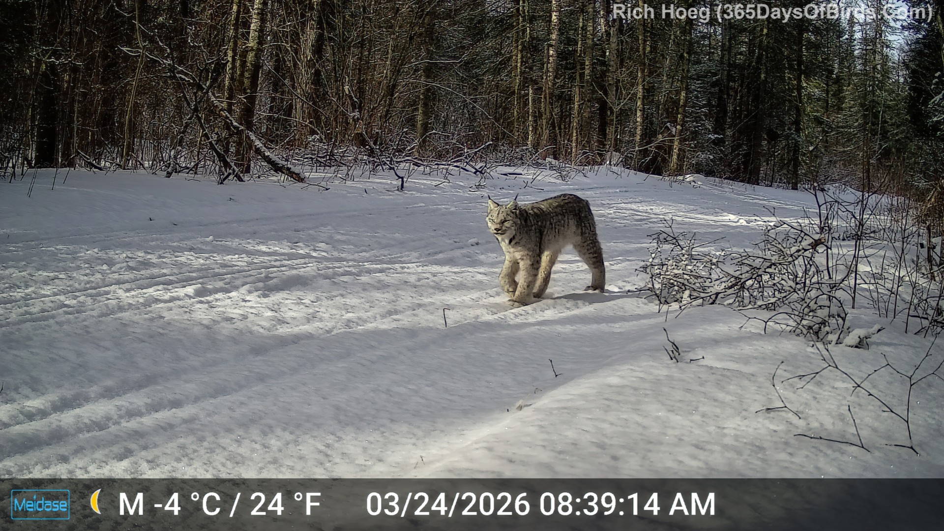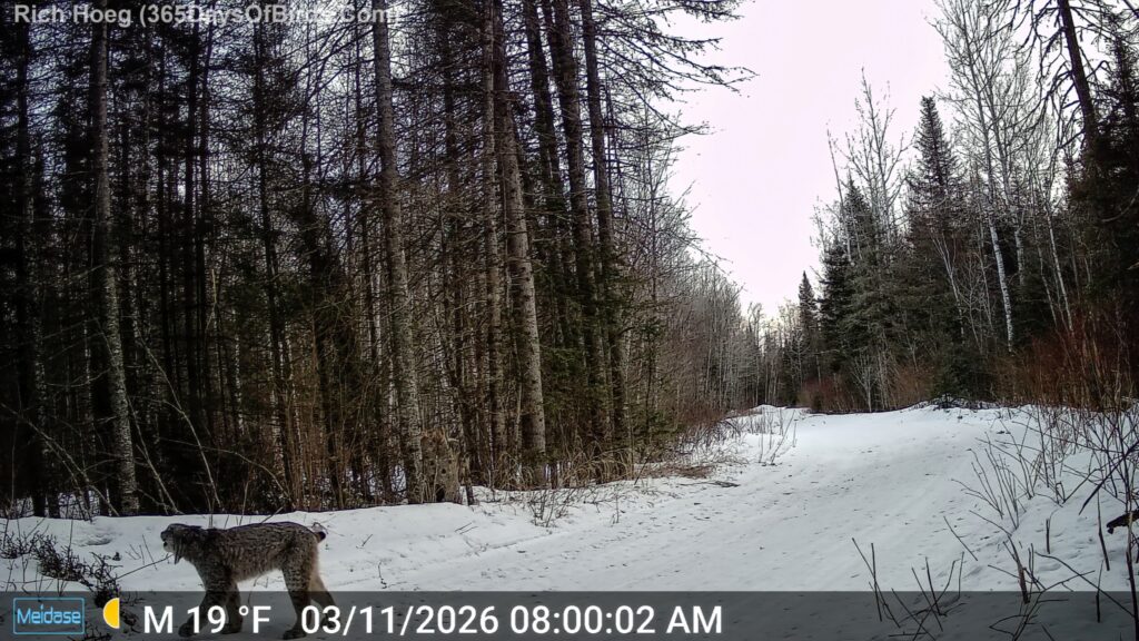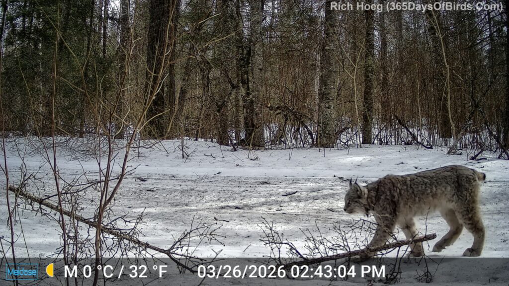 Earlier this winter (2026) I discovered multiple Canada Lynx were using a specific “scent branch” to mark territory. In early March I placed five trail cams pointed at “the branch”. The Lynx came through! One Lynx even roars for the camera (40 seconds into video)! See near the end of this post the still image of “the roar” which was captured by one of my cameras.