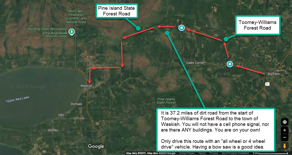 This post documents one of my favorite wilderness tours … from the town of Big Falls, Minnesota (a bit south of International Falls & the Canadian Border) to the town of Waskish, Minnesota (on the shores of Upper Red Lake). Your route will take you through amazing wilderness, and your drive will be on dirt roads for 37.2 miles from the start of Toomey-Williams Forest Road to Waskish.