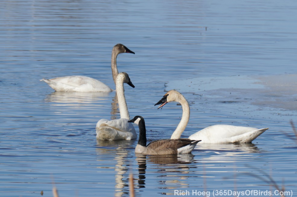 Although Rice Lake is not a suitable breeding pond, A Trumpeter Swan asks the Canada Swan to move along! Swans and Geese don’t get along.