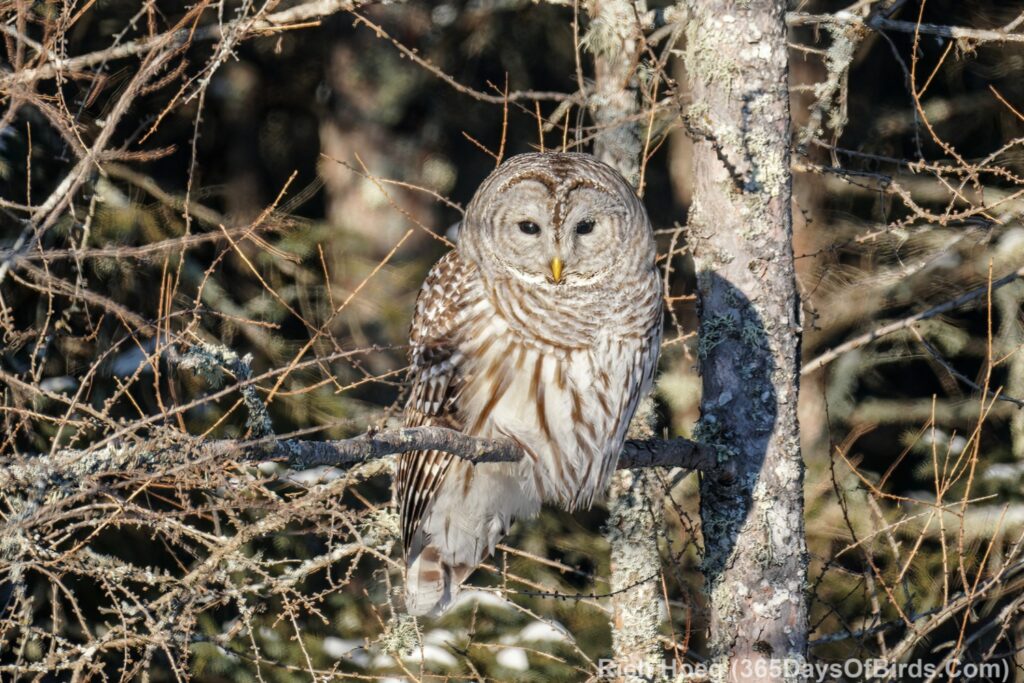 Jackpot! I spent 90 minutes on these two prime birding roads, and saw nary another person the entire time. I did have to deal with two snow plows but surprisingly even when the monster, loud trucks plowed within 15 yards of the the owl, it did not flush. I felt certain I would get some flights photos, and have about 20 images of two snow plows and an owl which seems to be thinking, what … me worry?!