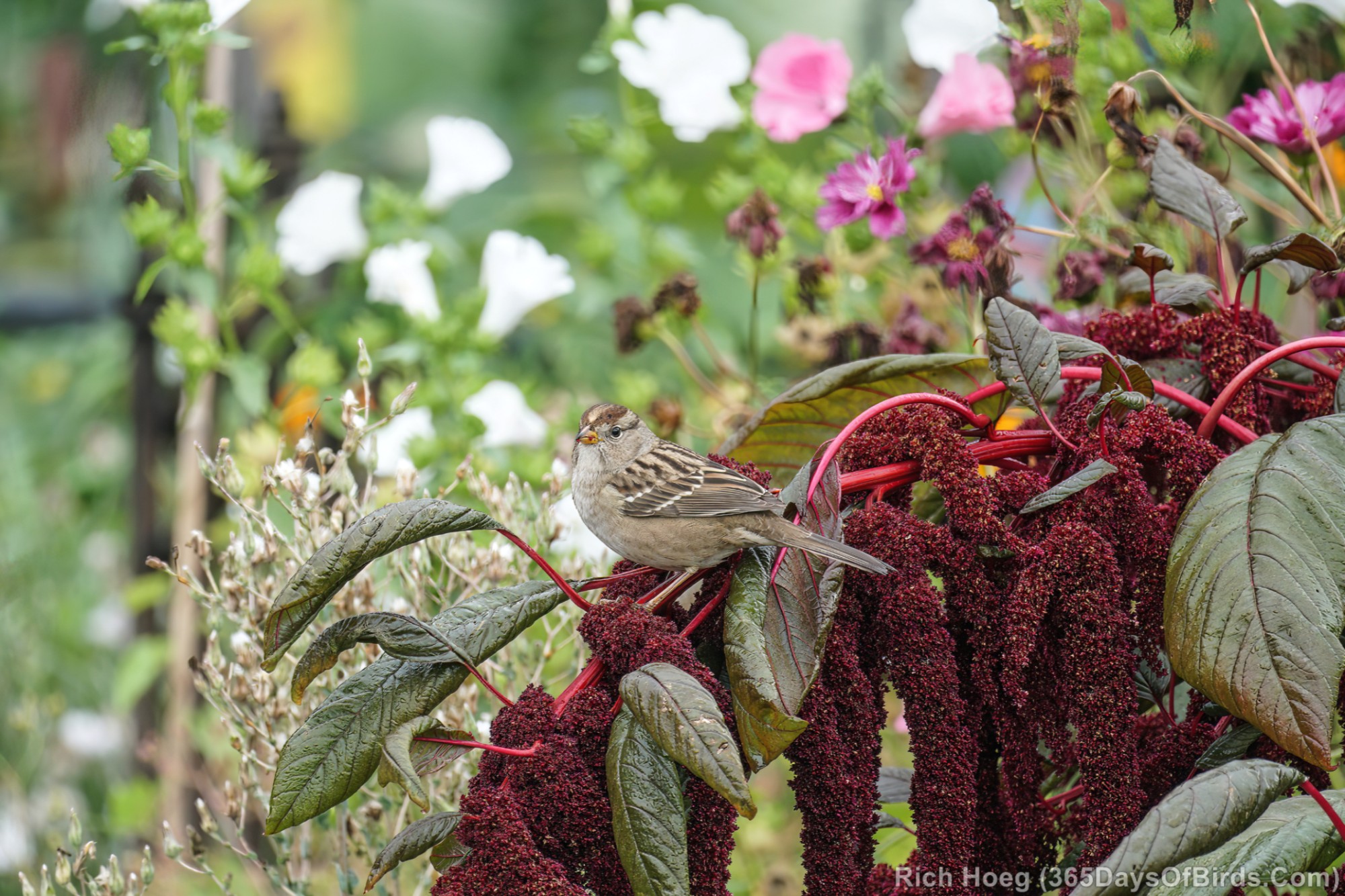 This is the time of year to visit your local community garden. Flowers are now “going to seed” and vegetables are ready for harvest, which means FOOD FOR BIRDS! Earlier in the summer these gardens don’t have lots of birds as the food factory has not yet started up, but in early Fall … Uff Dah!