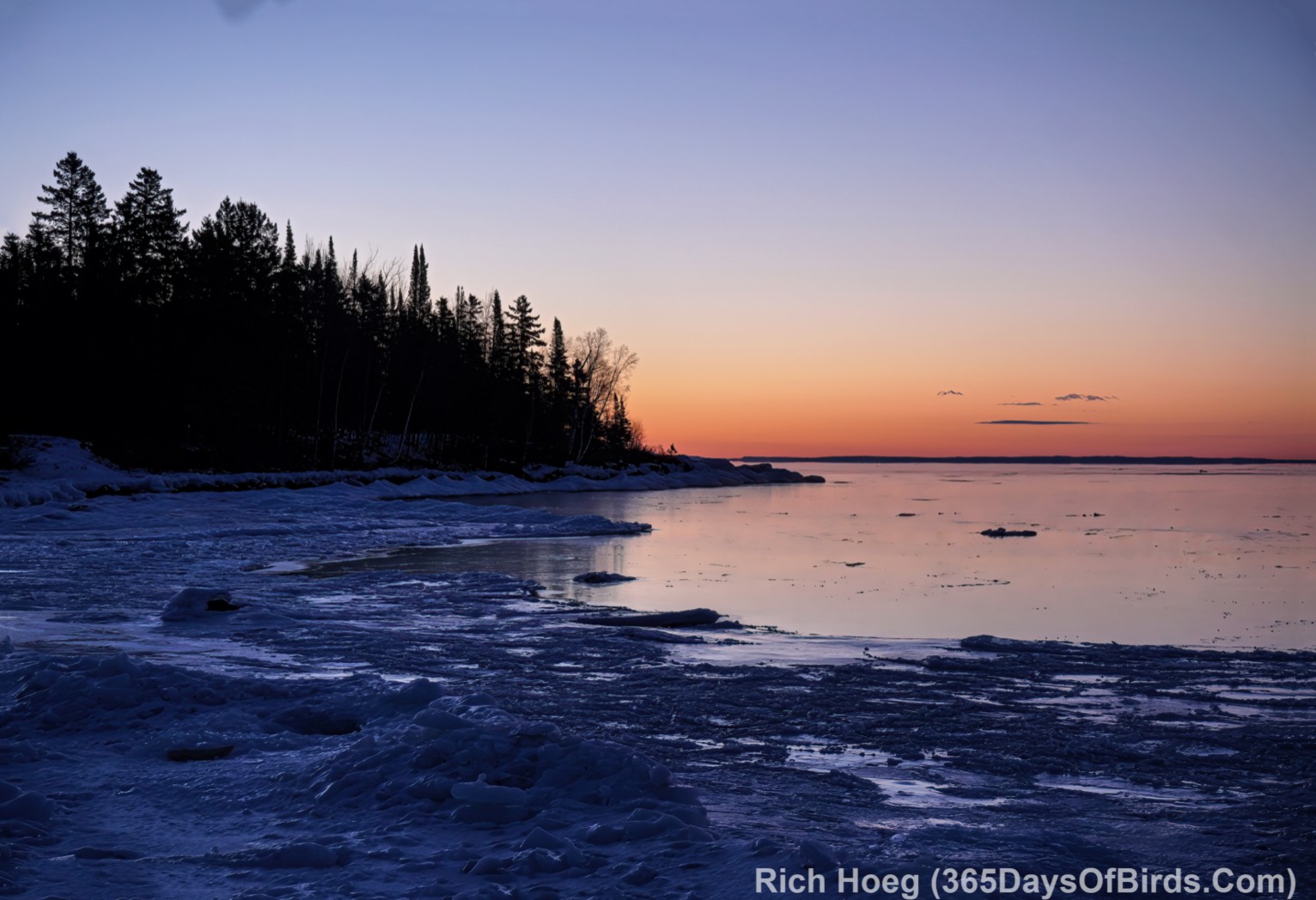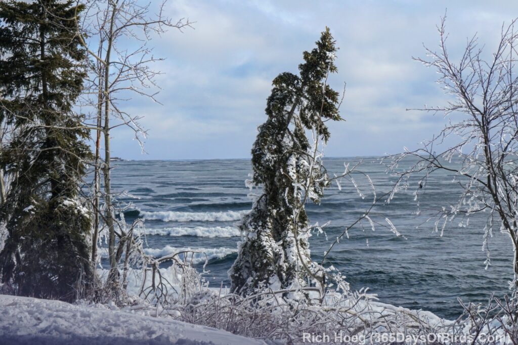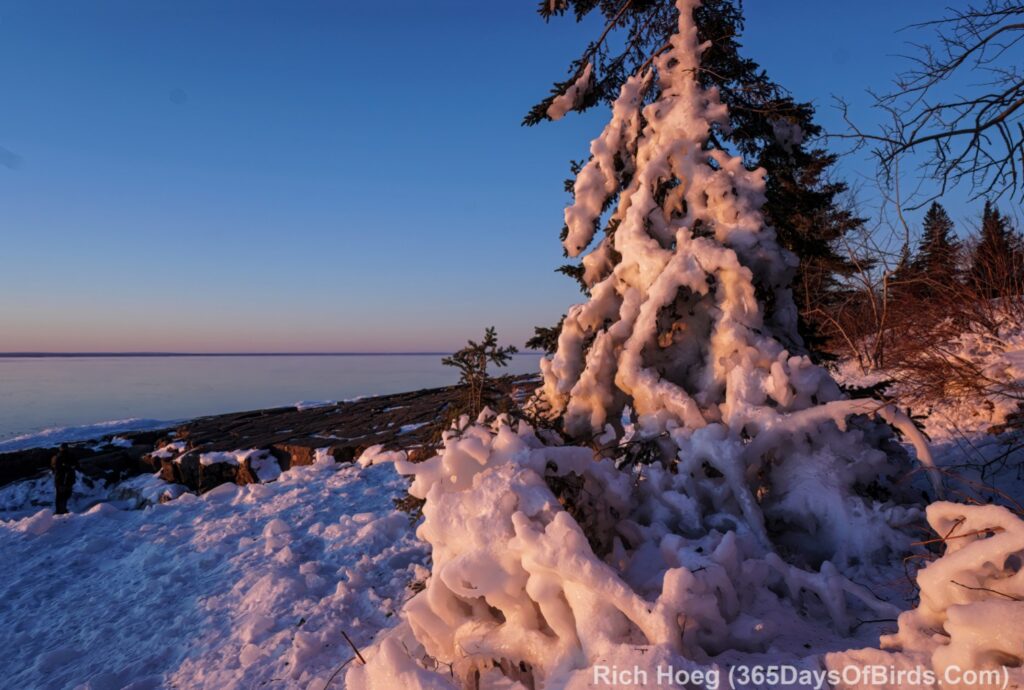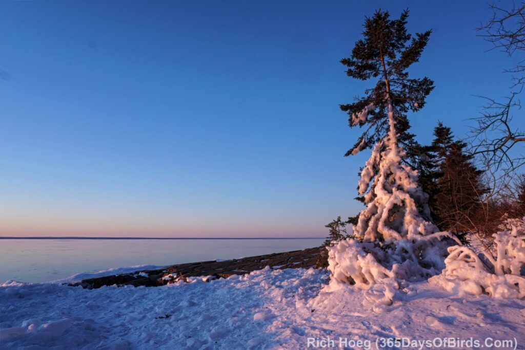 About 10 minutes after sunup … looking along the shore at Stoney Point. Calm today, but the pine shows the evidence of last week’s blizzard and crazy waves.