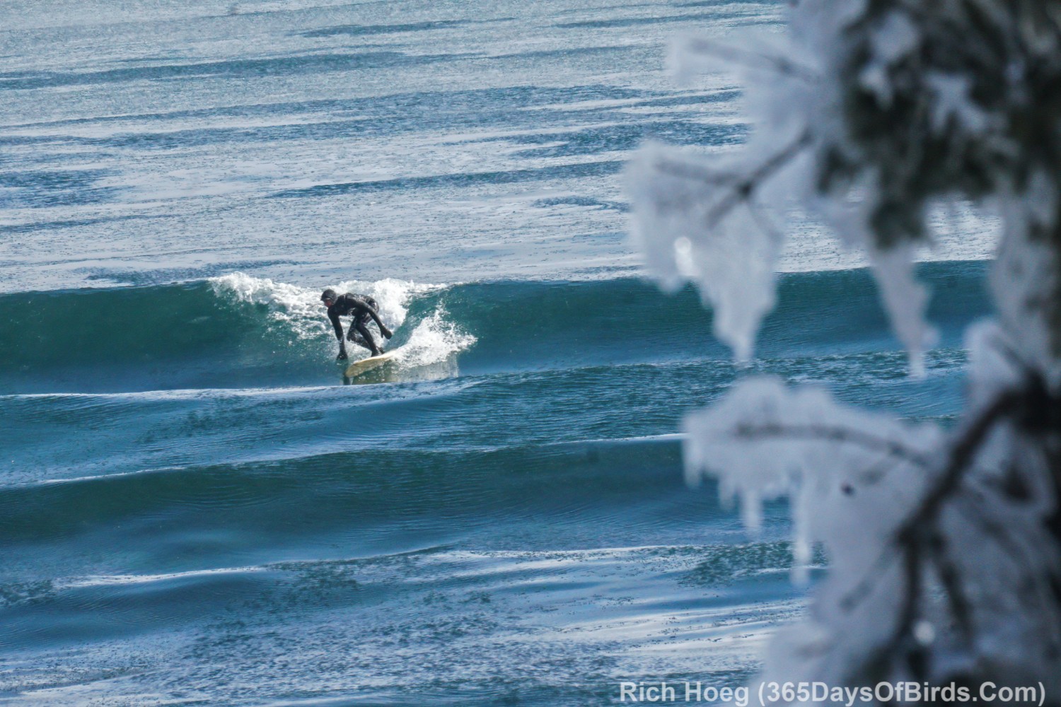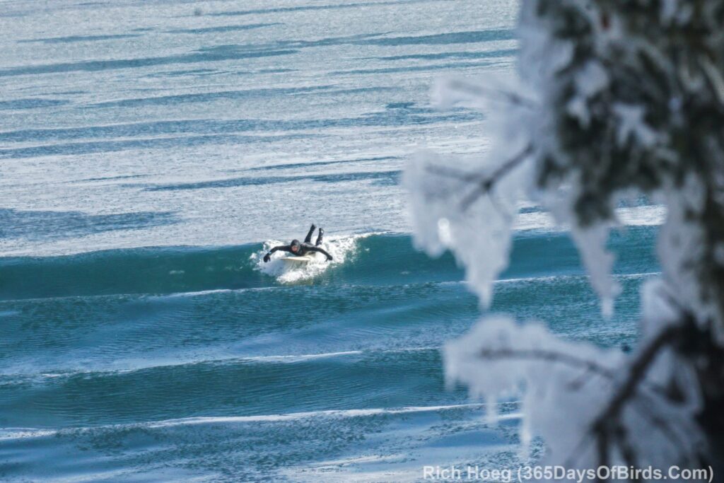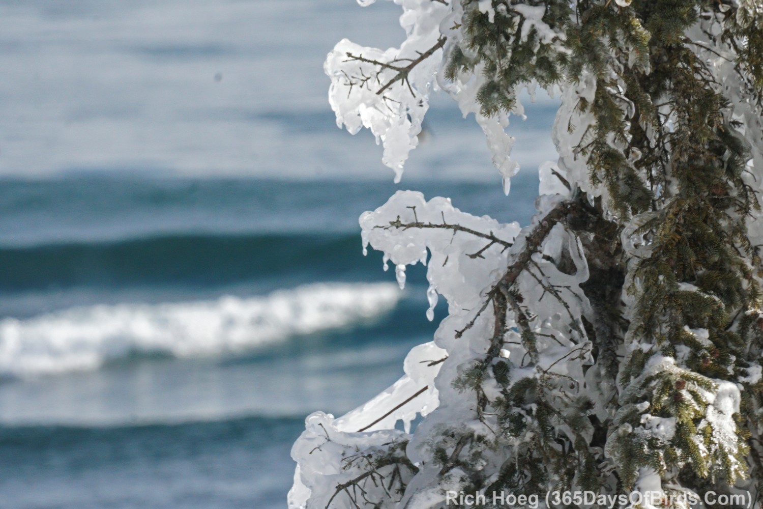 About 10 minutes after sunup … looking along the shore at Stoney Point. Calm today, but the pine shows the evidence of last week’s blizzard and crazy waves.