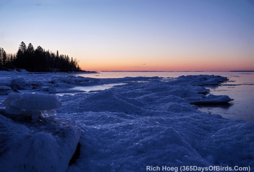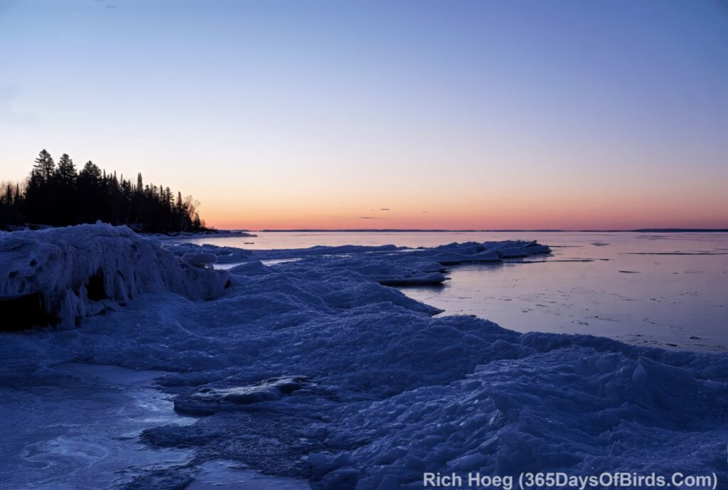 This morning, the 1st of March, dawned bright, clear and cold. My first stop was the boreal forest near my house where my local Great Horned Owls, Les and Amy, were hooting their love back and forth, but then it was on to take in the pre-dawn light out over Lake Superior … or Ice Planet Zelda!
